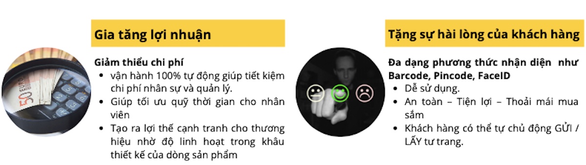 Ứng dụng smart locker trong giao nhận và phục vụ nhu cầu mua sắm trực tuyến đang được các siêu thị – trung tâm mua sắm chú trọng triển khai để: Tiết kiệm thời gian và công sức của khách hàng, nâng cao chất lượng dịch vụ và đẩy mạnh hiệu quả kinh doanh. Tự động hóa quy trình mua hàng: Mang lại sự chủ động và linh hoạt hơn cho khách hàng trong nhu cầu online shopping: dễ dàng đến lấy hàng bất cứ thời gian nào họ muốn. Dễ dàng lắp đặt tại các vị trí, tối ưu hóa diện tích sử dụng như bãi đỗ xe, cổng ra vào,.. nhờ vào độ bền bỉ cao, bảo mật an toàn và khả năng chống chịu thời tiết tốt. | ![]() |