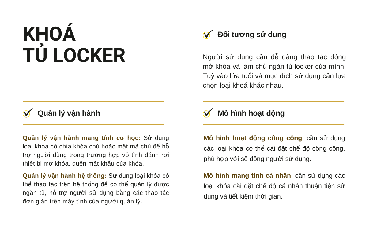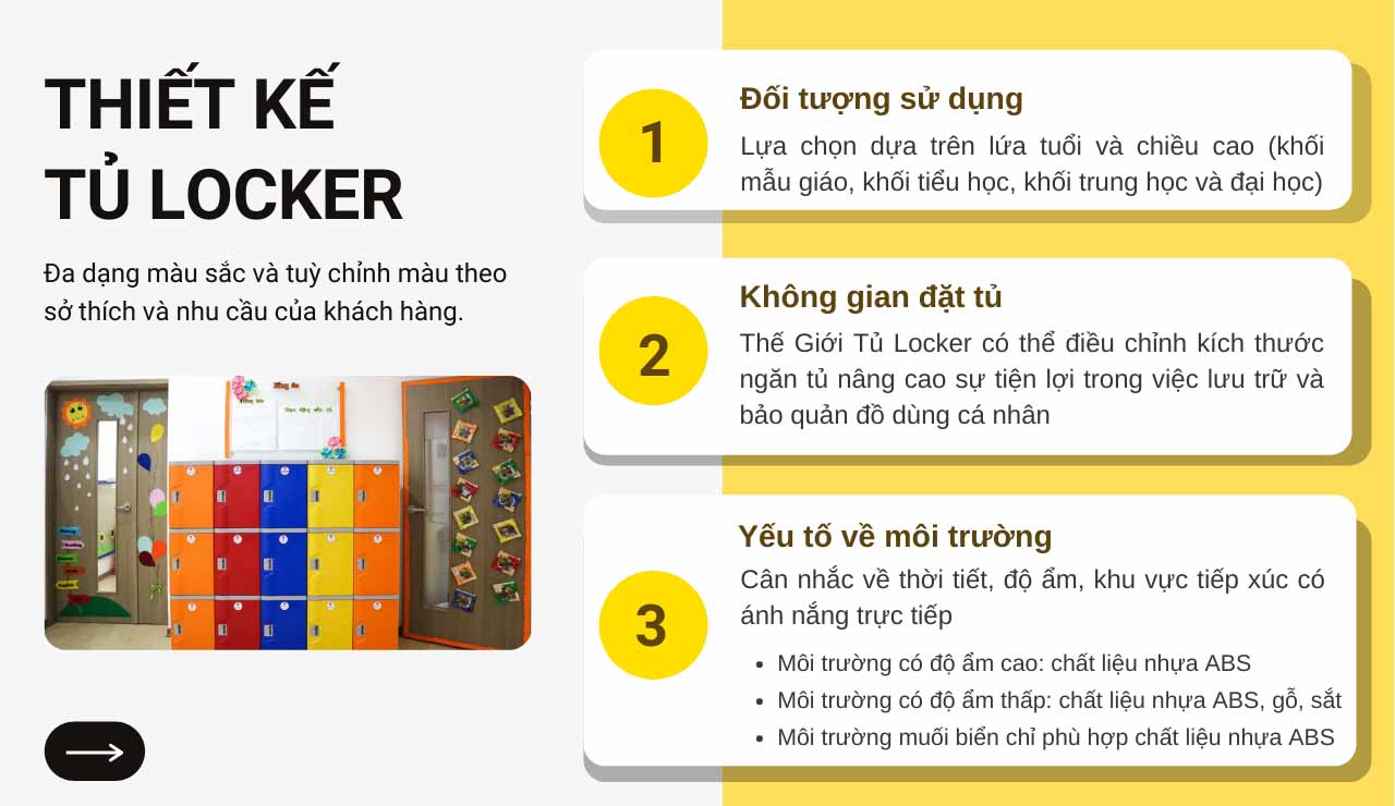 ![]() | Chất liệu gỗ (ván gỗ công nghiệp MFC/MDF) Bề mặt tủ sẽ được sơn bóng hoặc phủ laminate để bảo vệ tủ trong quá trình sử dụng. Điểm đặc biệt là tủ locker gỗ mang đến nét sang trọng, lịch sự khiến cho không gian trở nên chuyên nghiệp và hiện đại. |