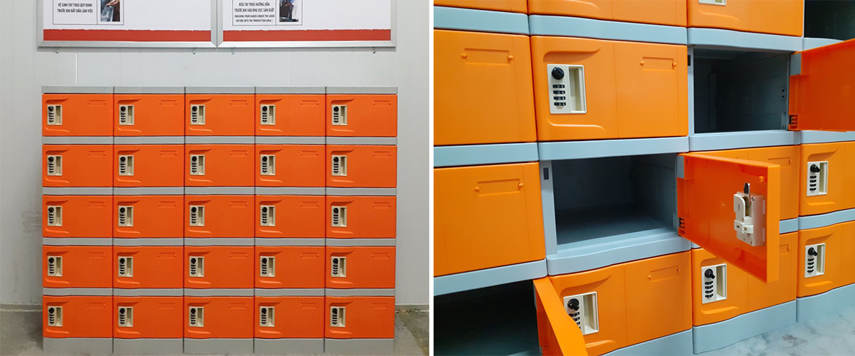 Tại khu vực lưu trữ đồ các nhân, mỗi một công nhân sẽ được cung cấp một chiếc tủ locker riêng biệt để cất giữ giày và tư trang an toàn, ngăn nắp. Qua đó, diện tích nhà máy sẽ được tối ưu hoá tối đa, đảm bảo vệ sinh, không gian thoáng mát, hiện đại. Ngoài ra, một chiếc tủ chắc chắn cùng hệ thống bảo mật an toàn sẽ giúp tài sản của công nhân được giữ gìn cẩn thận. Phía nhà máy có thể đơn giản hoá bài toán vận hành quản lý khu vực tài sản mà không cần tốn quá nhiều chi phí phát sinh.