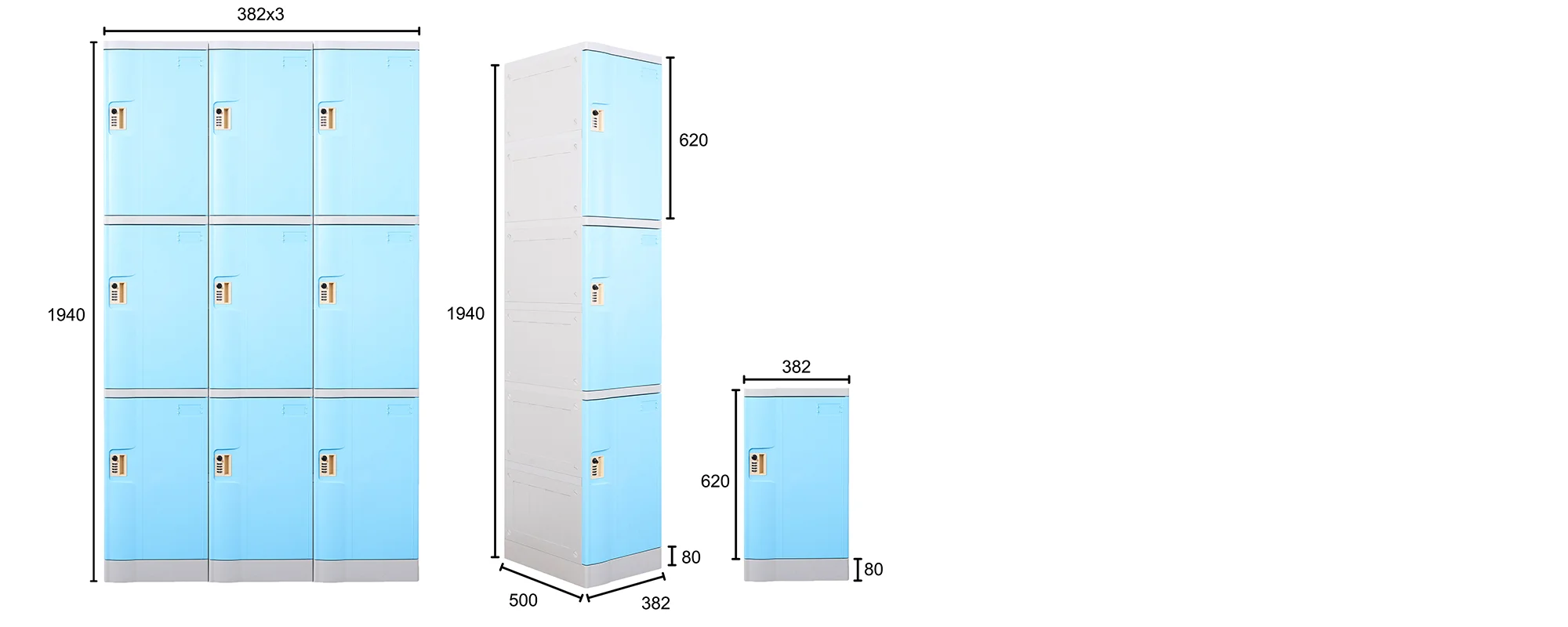 • 3 cột 3 tầng kết hợp lại (9 ngăn): 1940 x 960 x 500 (chiều cao đã bao gồm chân đế 80mm)